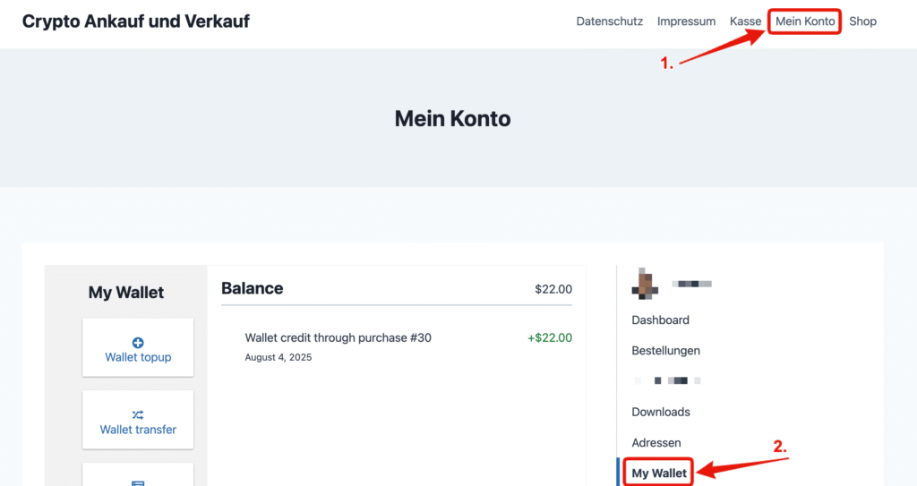 Zum kaufen von Kryptowährungen benötigst du einen Account auf unserer Webseite. Nachdem du dich erfolgreich registriert hast, klicke im Menü auf „Mein Konto“. Im User Dashboard angekommen, findest du die Option „My Wallet“. Klicke auf diesen Link um zu deiner Wallet zu gelangen.